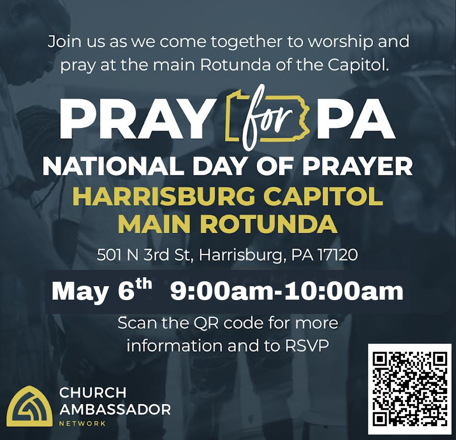 The Pray for PA Tour is an initiative of the Church Ambassador Network seeking to facilitate an atmosphere of unity, worship and corporate humility before God. We believe this tour plays a key role in uniting the body of Christ in our state to come together and pray for our children, schools, families, legislature, governing leaders and nation. Join the hundreds of believers who will unite in worship and seek the face of God in cities around our state and believe for change and healing in our land. Our National Day of Prayer event is May 6th at the Capitol in Harrisburg, and we have other Pray for PA tour stops across the state. Visit pafamily.org/prayforpa for more info and to RSVP, and stay tuned as more events will be added in the coming days.